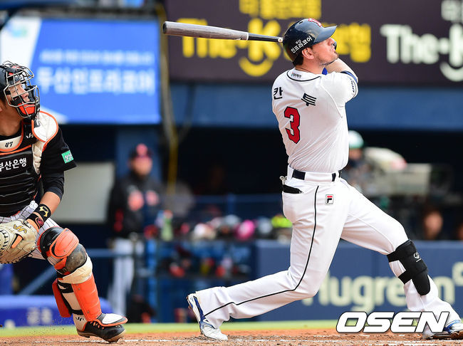 3회말 두산 공격 2사 1루 상황 칸투가 중견수 깊은 플라이 타구를 날리고 있다. 일어서며 타구를 바라보는 롯데 포수 강민호(왼쪽).