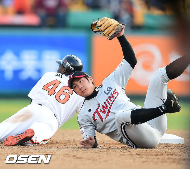 19일 오후 대전구장에서 열린 '2014 한국야쿠르트 세븐 프로야구' 한화 이글스와 LG 트윈스의 경기, 4회말 1사 한화 피에가 안타를 날린후 2루 베이스로 귀루중에 LG 오지환 유격수에게 아웃되고 있다.