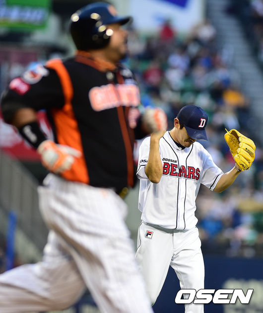 6회초 롯데 공격 2사 1, 2루 상황 히메네스를 내야 땅볼로 이끌며 무실점으로 이닝을 마친 두산 선발 노경은이 환호하고 있다.