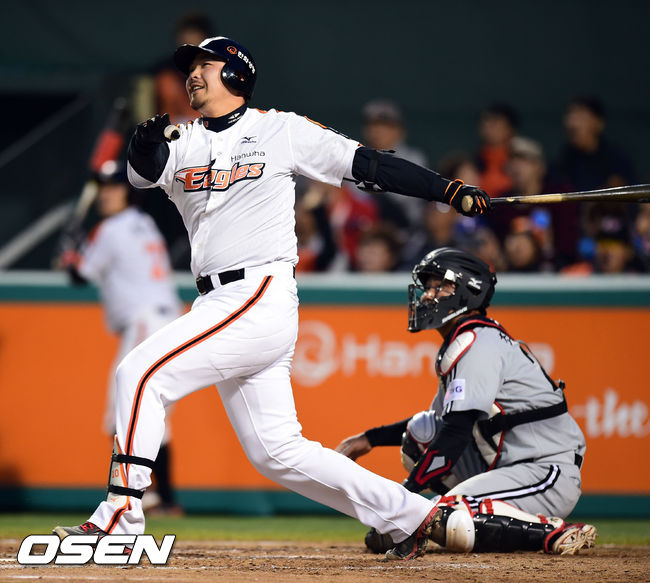 19일 오후 대전구장에서 열린 '2014 한국야쿠르트 세븐 프로야구' 한화 이글스와 LG 트윈스의 경기,7회말 1사 1,3루 대타 김태완이 3점 홈런을 날리고 있다.