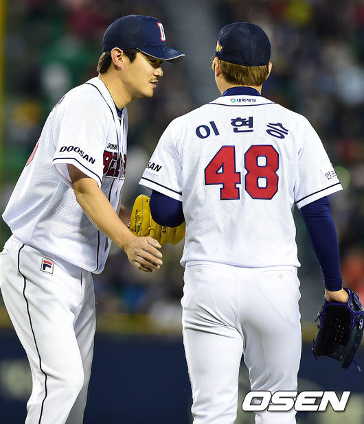7회초 롯데 공격 2사 2, 3루 상황 두산 선발 노경은이 마운드를 내려가며 교체되는 투수 이현승과 인사를 나누고 있다.