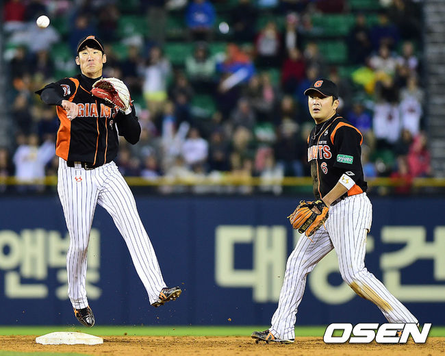 7회말 두산 공격 1사 1, 3루 상황 칸투의 내야수 얕은 뜬공을 롯데 오승택이 원바운드로 잡아내 1루로 공을 뿌리고 있다. 원바운드로 공을 잡은 오승택은 바로 2루를 밟아 포스아웃 시킨 뒤 1루로 공을 뿌려 더블플레이를 완성했다.