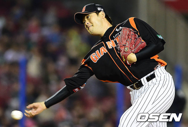 8회말 두산 공격 2사 만루상황 마운드에 오른 롯데 투수 정대현이 힘차게 공을 뿌리고 있다.