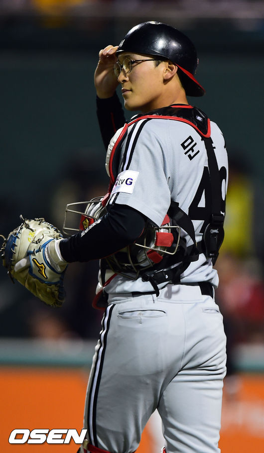19일 오후 대전구장에서 열린 '2014 한국야쿠르트 세븐 프로야구' 한화 이글스와 LG 트윈스의 경기,9회초 LG 문선재가 포수 장비를 착용하고 있다.