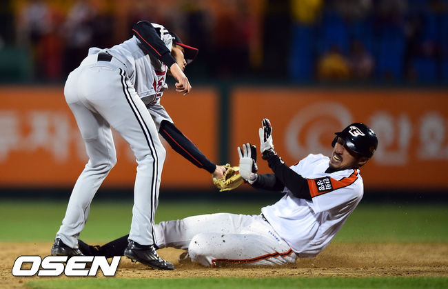 19일 오후 대전구장에서 열린 '2014 한국야쿠르트 세븐 프로야구' 한화 이글스와 LG 트윈스의 경기,9회말 2사 1루 한화 이용규의 타석때 LG 문선재 포수가 2루 송구해 김경언 1루 주자를 도루 저지하고 있다.