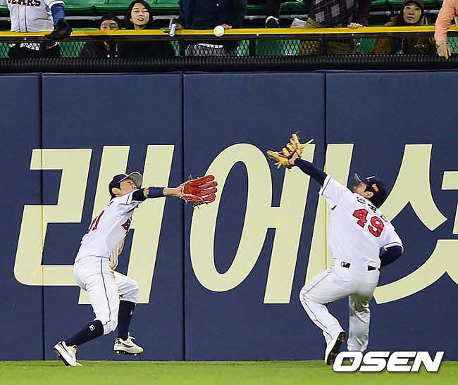 9회초 롯데 공격 선두타자로 나선 대타 박종윤의 우중간 3루타 때 두산 중견수 정수빈과 우익수 민병헌이 동시에 달려가고 있다. 결국 두 수비수가 부딪히며 타자주자는 3루까지.