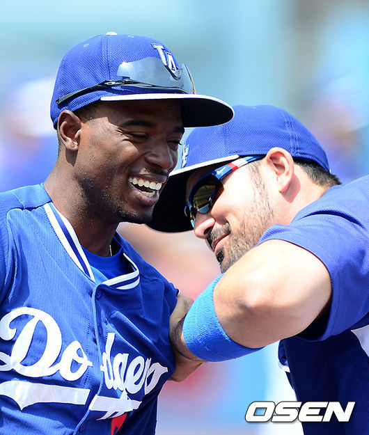 경기에 앞서 다저스 고든과 곤잘레스가 훈련을 하며 장난치고 있다.