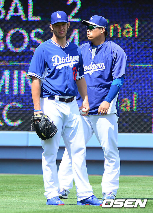 경기에 앞서 다저스 류현진이 외야에서 캐치볼을 하고 있다.