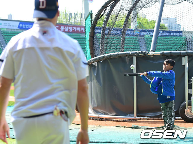20일 오전 서울 잠실야구장에서 열리는 '2014 한국야쿠르트 세븐 프로야구' 두산 베어스 대 롯데 자이언츠의 경기에 앞서 두산 칸투가 아들에게 배팅볼을 던져주고 있다.
