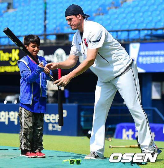 20일 오전 서울 잠실야구장에서 열리는 '2014 한국야쿠르트 세븐 프로야구' 두산 베어스 대 롯데 자이언츠의 경기에 앞서 두산 칸투가 아들에게 배트 잡는법을 알려주고 있다.