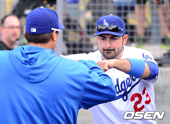경기전 다저스 류현진이 곤잘레스와 파이팅을 하고 있다./jpnews@osen.co.kr