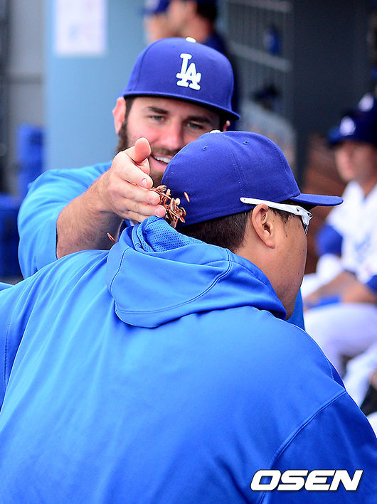 경기전 다저스 류현진이 반 슬라이크와 장난을 치고 있다./jpnews@osen.co.kr