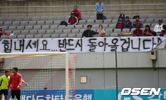 20일 오후 서울 월드컵 경기장에서 열린 ‘현대오일뱅크 K리그 클래식 2014’ 9라운드 FC 서울과 포항 스틸러스의 경기, 세월호 침몰 사건 실종자들의 무사 귀환을 기원하는 플래카드가 경기장에 걸려있다.