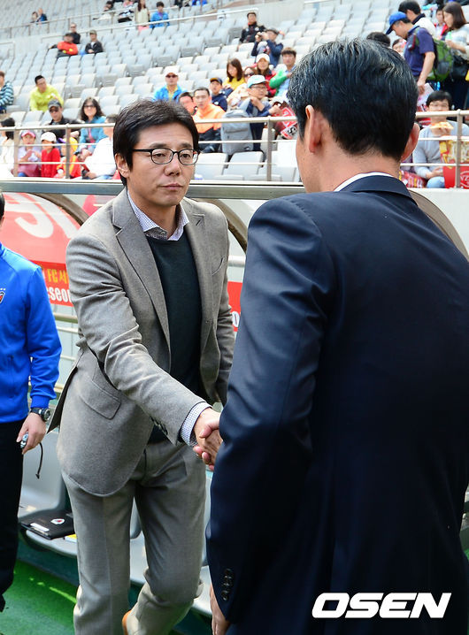 20일 오후 서울 월드컵 경기장에서 열린 ‘현대오일뱅크 K리그 클래식 2014’ 9라운드 FC 서울과 포항 스틸러스의 경기, 경기 전 포항 황선홍 감독과 서울 최용수 감독이 악수를 나누고 있다.