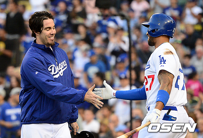 5회말 무사 만루에서 다저스 해런이 라미레즈의 내야땅볼에 홈을 밟고 멧 캠프와 하이파이브를 하고 있다./jpnews@osen.co.kr