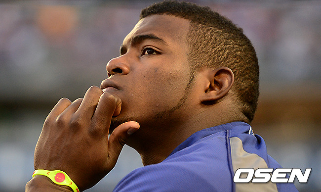 선발에서 제외된 다저스 푸이그가 더그아웃에서 경기를 지켜보고 있다./jpnews@osen.co.kr