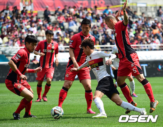20일 오후 서울 월드컵 경기장에서 열린 ‘현대오일뱅크 K리그 클래식 2014’ 9라운드 FC 서울과 포항 스틸러스의 경기, 전반 포항 김승대가 돌파를 시도하고 있다.