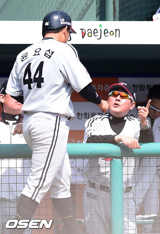 20일 오후 대전구장에서 열린 '2014 한국야쿠르트 세븐 프로야구' 한화 이글스와 LG 트윈스의 경기, 2회초 2사 3루 LG 오지환이 1타점 적시타때 홈을 밟은 3루 주자 윤요섭이 김기태 감독과 하이파이브를 하고 있다.
