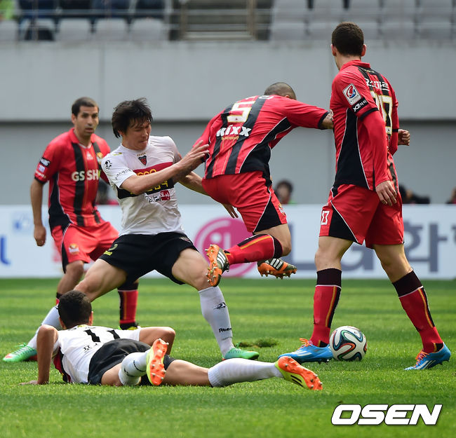 20일 오후 서울 월드컵 경기장에서 열린 ‘현대오일뱅크 K리그 클래식 2014’ 9라운드 FC 서울과 포항 스틸러스의 경기, 전반 포항 김태수와 강수일이 차두리를 막아보려 하고 있다.
