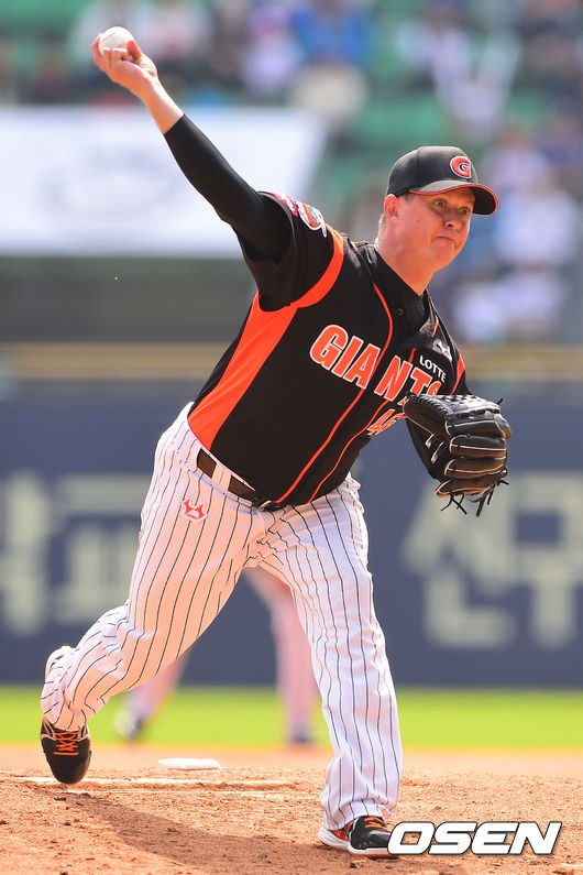 1회말 롯데 선발 옥스프링이 역투하고 있다.