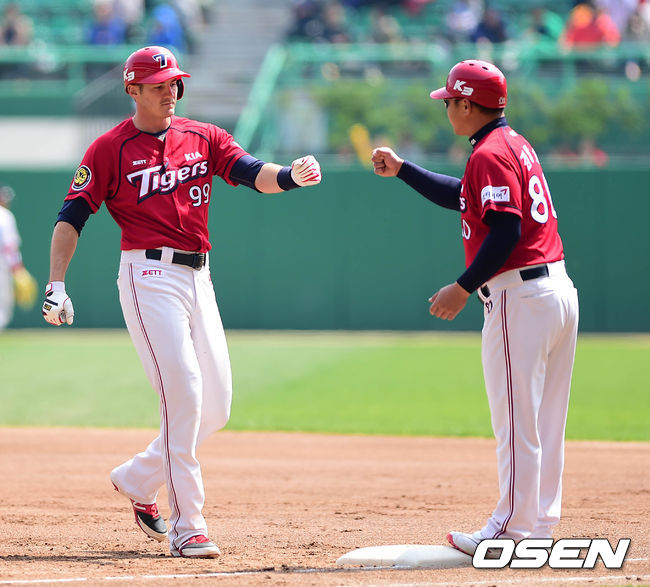 1회초 1사 2루에서 KIA 필이 중전 적시타를 치고 김창희 코치와 하이파이브를 하고 있다.