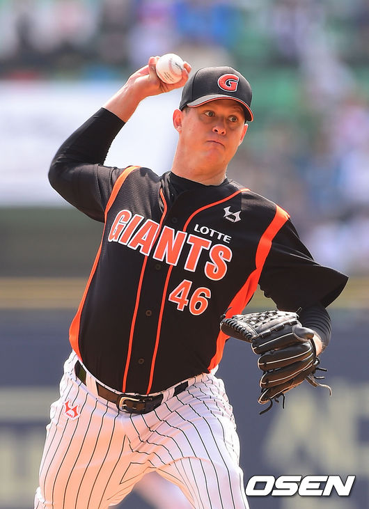 1회말 롯데 선발 옥스프링이 역투하고 있다.
