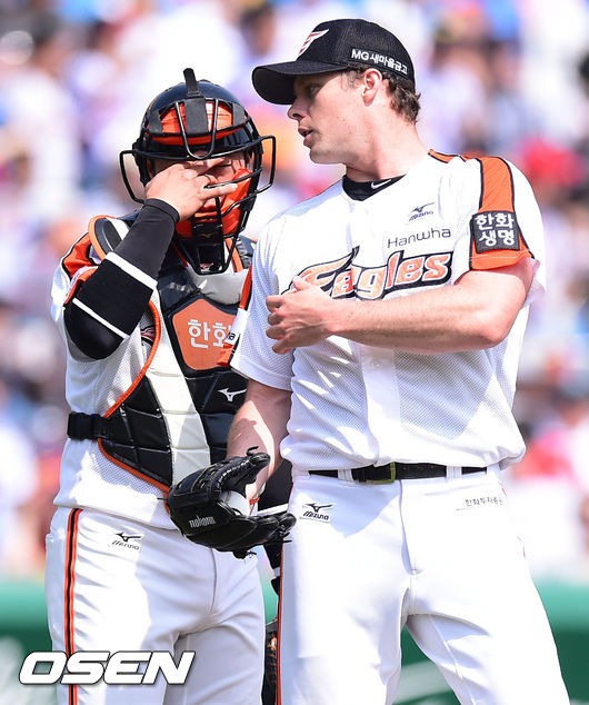 20일 오후 대전구장에서 열린 '2014 한국야쿠르트 세븐 프로야구' 한화 이글스와 LG 트윈스의 경기, 2회초 3실점 허용한 한화 앨버스 선발투수와 김민수 포수가 이야기를 나누고 있다.