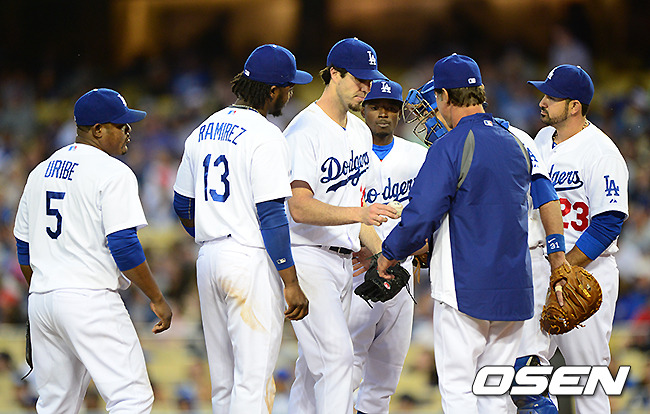 8회초 1사 1루에서 다저스 해런이 마운드를 내려가고 있다./jpnews@osen.co.kr
