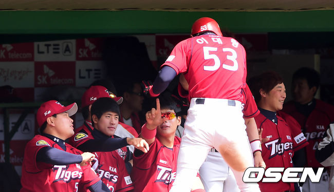 1회초 1사 2루에서 KIA 필의 중전 적시타 때 홈을 밟은 2루주자 이대형이 더그아웃에서 동료들과 하이파이브를 하고 있다.