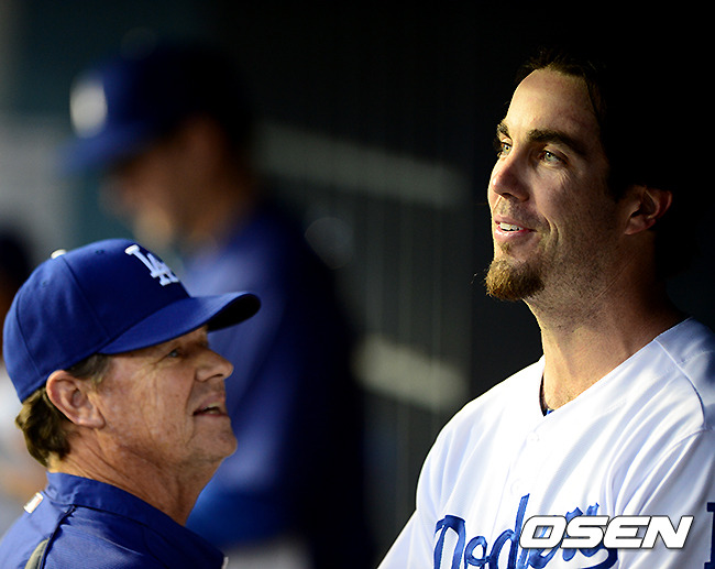 8회초 1사 1루에서 다저스 해런이 마운드를 내려가고 더그아웃에서 허니컷 코치의 격려를 받고 있다./jpnews@osen.co.kr