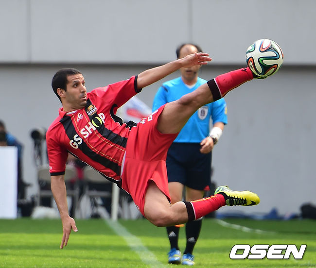 20일 오후 서울 월드컵 경기장에서 열린 ‘현대오일뱅크 K리그 클래식 2014’ 9라운드 FC 서울과 포항 스틸러스의 경기, 전반 서울 에스쿠데로가 볼을 향해 몸을 날리고 있다.