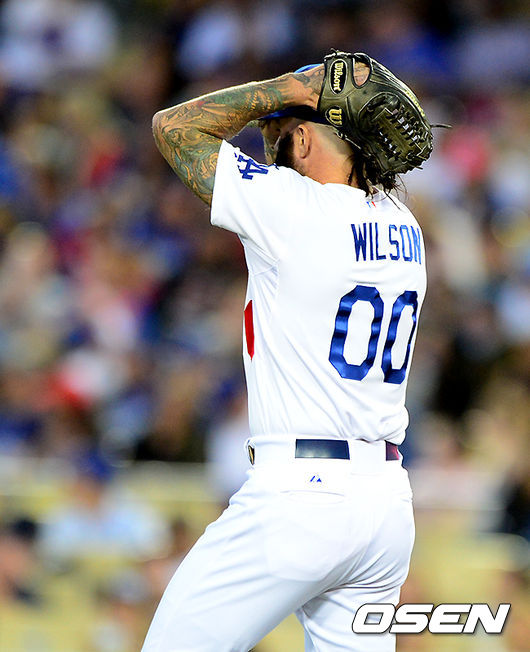 8회초 1사 1루에서 다저스 윌슨이 애리조나 몬테로에 볼넷을 허용하고 아쉬워하고 있다./jpnews@osen.co.kr