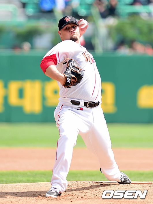 1회초 무사에서 SK 선발투수 레이예스가 힘차게 공을 던지고 있다.