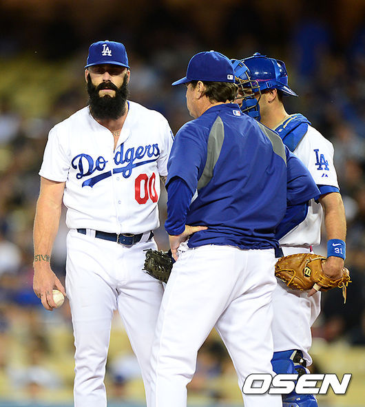 8회초 2사 1,2루에서 다저스 윌슨이 애리조나 프라도에 2타점 적시 2루타를 허용하자 허니컷 코치가 마운드에 올라 격려하고 있다./jpnews@osen.co.kr