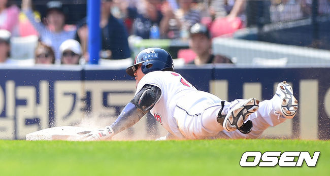 2회말 1사 두산 홍성흔이 2루수 앞 땅볼을 때린 뒤 헤드퍼스트 슬라이딩으로 1루까지 들어가고 있다.