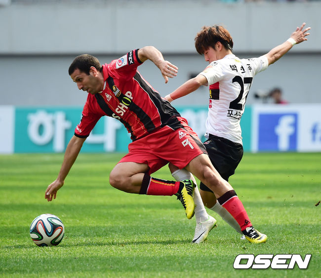 20일 오후 서울 월드컵 경기장에서 열린 ‘현대오일뱅크 K리그 클래식 2014’ 9라운드 FC 서울과 포항 스틸러스의 경기, 전반 서울 에스쿠데로와 포항 박선주가 볼다툼을 하고 있다.