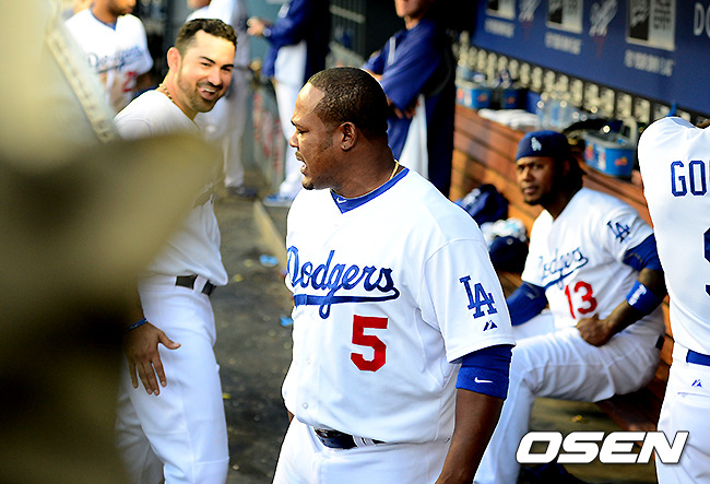 5회말 1사 3루에서 다저스 유리베가 중견수 플라이로 물러 난뒤 더그아웃에서 동료선수들의 장난에 기분나빠 하고 있다./jpnews@osen.co.kr