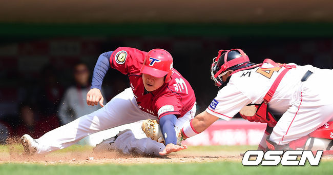 2회초 2사 2루에서 KIA 김선빈의 우전안타 때 홈으로 쇄도한 2루주자 김주형이 SK 포수 조인성에 의해 태그아웃 처리되고 있다.
