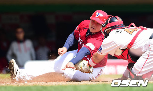2회초 2사 2루에서 KIA 김선빈의 우전안타 때 홈으로 쇄도한 2루주자 김주형이 SK 포수 조인성에 의해 태그아웃 처리되고 있다.
