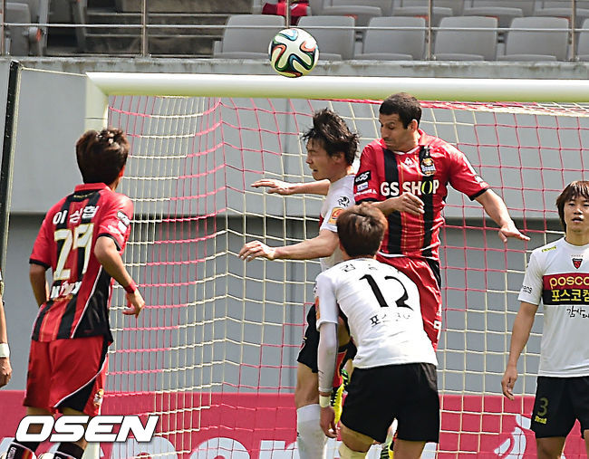 20일 오후 서울 월드컵 경기장에서 열린 ‘현대오일뱅크 K리그 클래식 2014’ 9라운드 FC 서울과 포항 스틸러스의 경기, 전반 서울 에스쿠데로가 포항 문전에서 포항 문태수보다 먼저 떠올라 헤딩슛을 시도하고 있다.