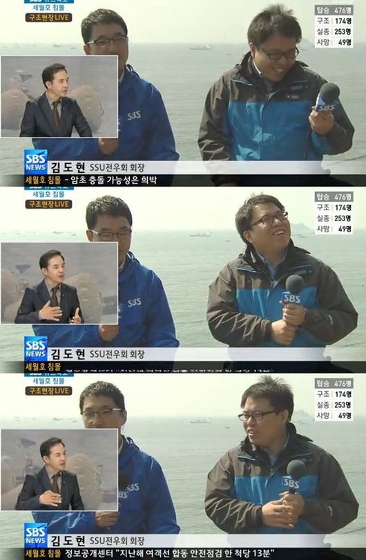20일 오전 방송된 SBS '뉴스특보-여객선 세월호 침몰'에서는 김도현 SSU 전우회 회장과의 대담이 진행되던 중 진도 가소 현장에 나와있는 기자 두 사람의 모습이 화면에 등장했다. 이 때 방송을 미처 준비하지 못했던 기자들이 웃음을 짓는 모습이 비춰진 것.