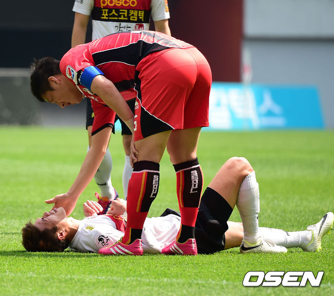 20일 오후 서울 월드컵 경기장에서 열린 ‘현대오일뱅크 K리그 클래식 2014’ 9라운드 FC 서울과 포항 스틸러스의 경기, 전반 포항 김승대가 고통을 호소하며 그라운드에 쓰러져 있자 서울 김진규가 상태를 살피고 있다.