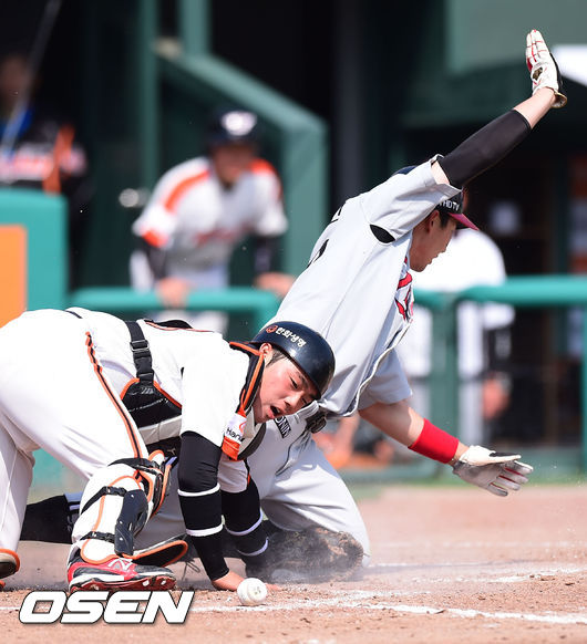 20일 오후 대전구장에서 열린 '2014 한국야쿠르트 세븐 프로야구' 한화 이글스와 LG 트윈스의 경기, 3회초 1사 1루 LG 이진영의 번트안타때 한화 김민수 포수가 송구실책을 했다. 그사이 1루 주자 손주인이 홈까지 쇄도해 세이프되고 있다.