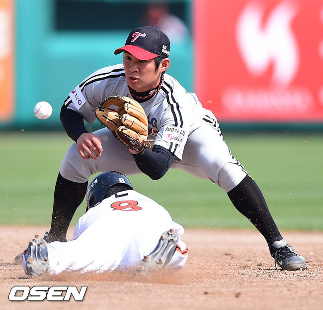 20일 오후 대전구장에서 열린 '2014 한국야쿠르트 세븐 프로야구' 한화 이글스와 LG 트윈스의 경기, 3회말 무사 1루 한화 김태균의 타석때 1루 주자 정근우가 도루성공하고 있다.