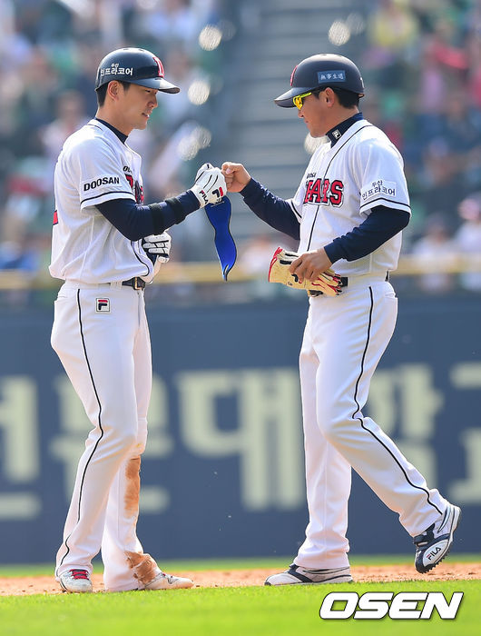 4회말 2사 2,3루 두산 김재호가 2타점 적시타를 때린 뒤 1루 코치와 기뻐하고 있다.