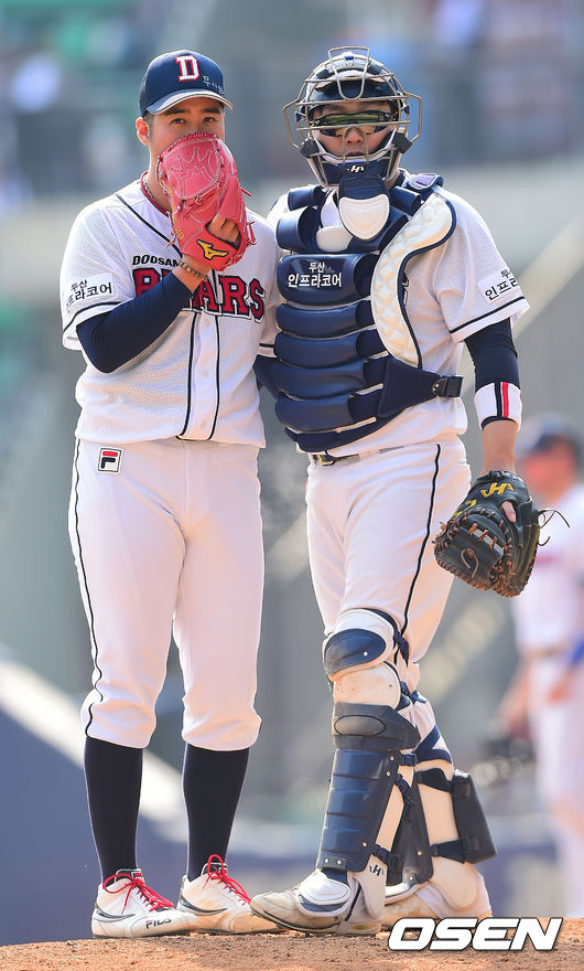 5회초 2사 1,2루 두산 유희관과 양의지가 마운드에 이야기를 나누고 있다.