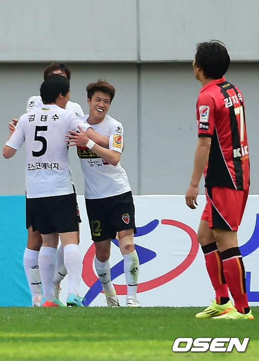 20일 오후 서울 월드컵 경기장에서 열린 ‘현대오일뱅크 K리그 클래식 2014’ 9라운드 FC 서울과 포항 스틸러스의 경기, 후반 포항 김승대가 선제골에 성공한 후 기뻐하고 있다.