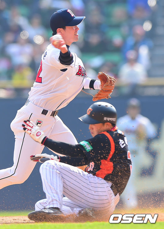 6회초 1사 1루 두산 김재호가 롯데 히메네스의 내야 땅볼때 1루주자 손아섭을 포스아웃으로 잡아낸 뒤 1루로 송구하고 있다.