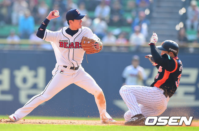 6회초 1사 1루 두산 김재호가 롯데 히메네스의 내야 땅볼때 1루주자 손아섭을 포스아웃으로 잡아낸 뒤 1루로 송구하고 있다.