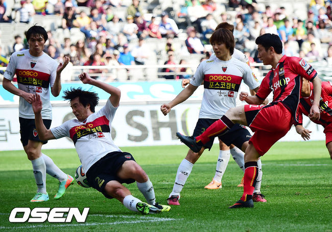 20일 오후 서울 월드컵 경기장에서 열린 ‘현대오일뱅크 K리그 클래식 2014’ 9라운드 FC 서울과 포항 스틸러스의 경기, 후반 서울 최효진이 강슛을 날렸으나 포항 박희철의 몸에 맞고 있다.